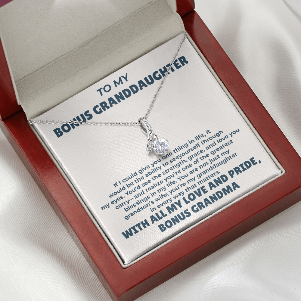 Imagine your granddaughter-in-law's reaction when she opens this stunning gift! The Alluring Beauty necklace features a petite ribbon-shaped pendant that is sure to dazzle your special someone. Whether it's a birthday or anniversary, make sure to get her a gift she will love for years to come.